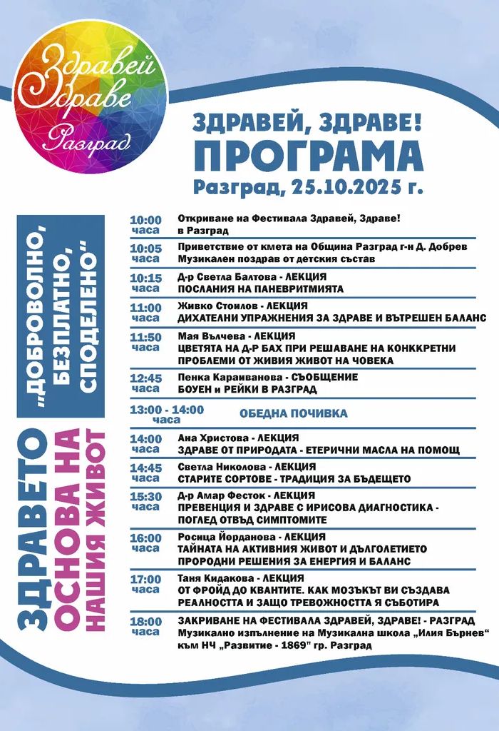 В събота, 25 октомври, Разград ще бъде домакин на първото издание на фестивала „Здравей, Здраве!“ – съобщи Кметът на Община Разград Добрин Добрев.